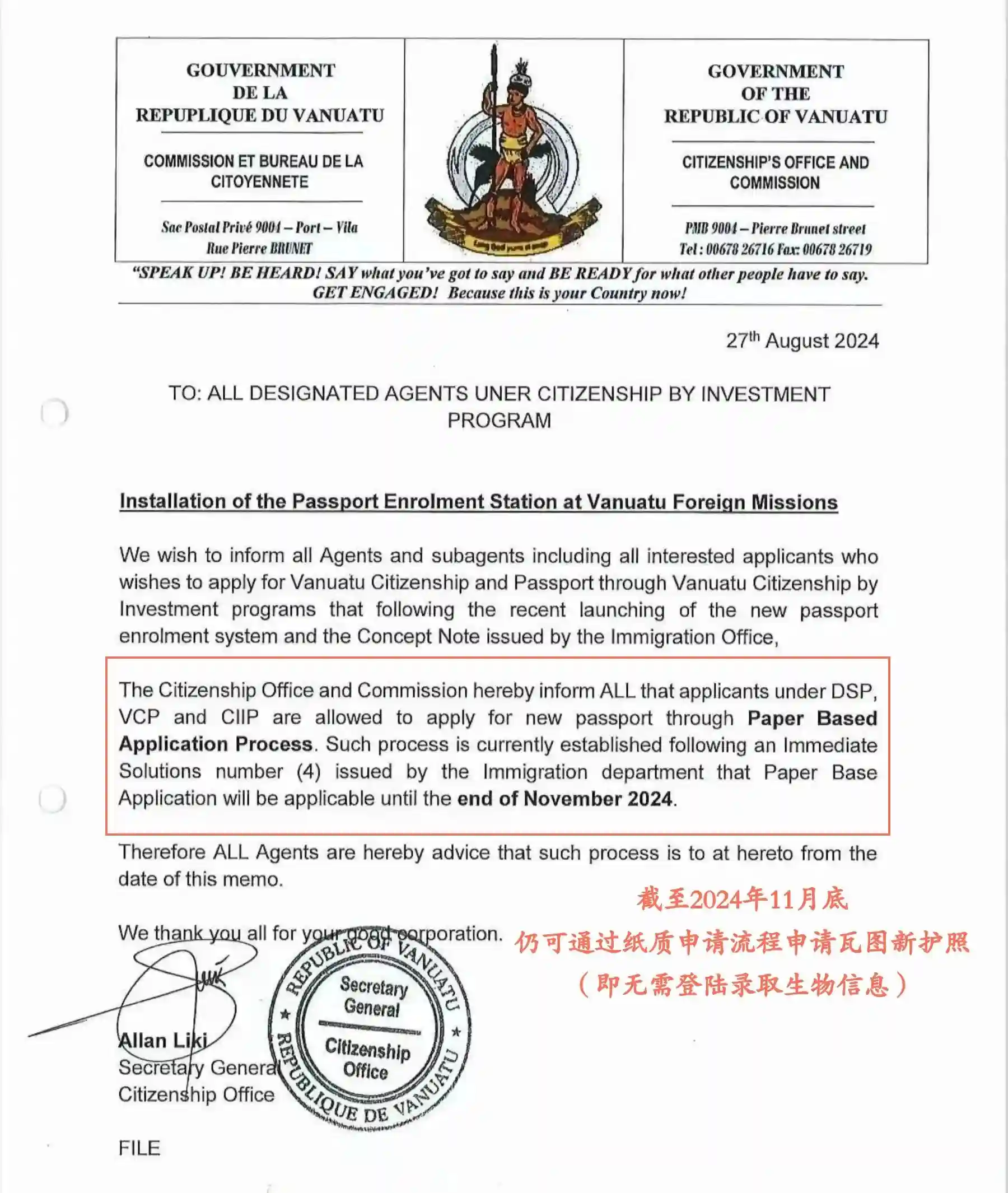 9月份,瓦努阿图移民部官宣于2024年12月1日起正式实施护照申请指纹打卡政策。