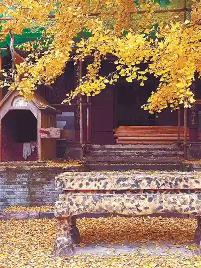 在大槐树一旁,还有金灿灿的银杏树,高度甚至超过了古槐树,枝繁叶茂,引得众人纷纷上前拍照。银杏树身在娘娘庙,该庙建于清代康熙年间,正殿三间,侧殿两间,庙前还有罗锅桥,与娘娘庙“同岁”。只不过,娘娘庙正在修缮中,暂未开放,但是仍有读者透过门缝观看庙内景象,拍下了落满银杏叶的古老庙宇的一隅。