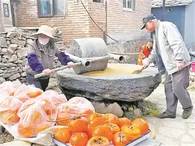 走过东瓮桥,一对老夫妇正在推着石碾磨面,在他们前面还放着一袋袋刚刚摘下的柿子。刘志洪上前为大家介绍,这一石碾是清代光绪十三年(1887年)的物件,至今还可以继续使用。