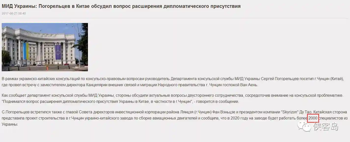细心的岛妹还是去找了俄文网站,据“国际文传电讯社”转引乌克兰《基辅晚报》的消息,近日,乌克兰外交部领事司司长波戈列尔采夫会见了重庆政府官员,讨论了领事合作等问题。波戈列尔采夫还会见了重庆两江新区开发投资集团的领导和北京天骄航空产业投资有限公司总裁杜涛。会谈中,天骄公司提出要与马达西奇公司合作组建航空发动机组装厂。根据双方磋商的内容,到2020年,工厂计划从乌克兰雇佣约2000名专家。
