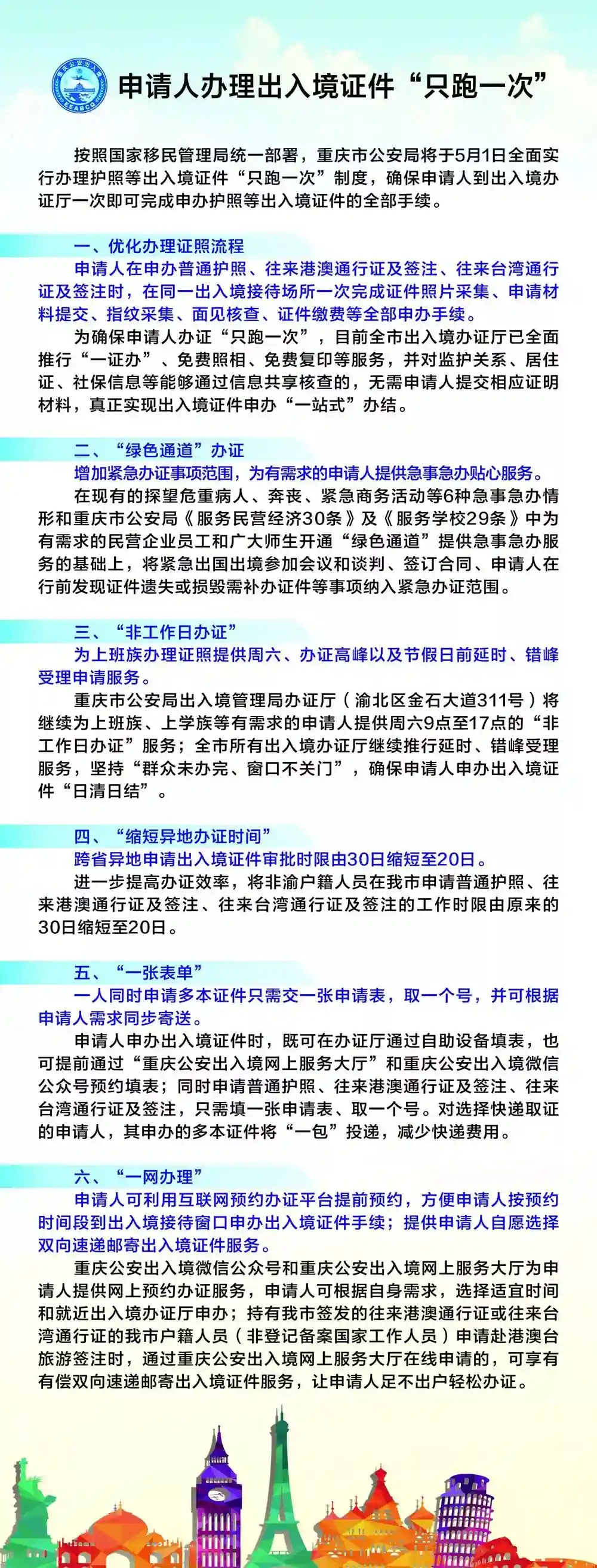 据了解,“只跑一次”制度包括优化办理证照流程、“绿色通道”办证、非工作日办证、缩短异地办证时间、一张表单、一网办理等六个方面的内容,通过这些举措,出入境民警以更优质高效的服务方便群众,提高了人民群众对出入境民警工作的满意度,促进了警民关系融洽和谐。
